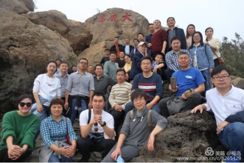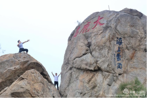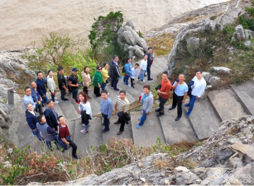 董事長(zhǎng)李德進(jìn)勇攀陡崖不畏難。懸崖頂上彎弓射大雕,彰顯男子漢的神力。在劉海粟先生題字“大鹿島”前留個(gè)集體照,個(gè)個(gè)都是攀登險(xiǎn)境的先鋒。