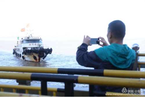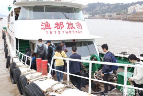 時(shí)光冉冉,早餐后,我們懷著依依不舍的心情,背起行囊要乘船返航玉環(huán)坎門了。接送我們返航的漁船:“漁都”號(hào),向我們駛來(lái)。